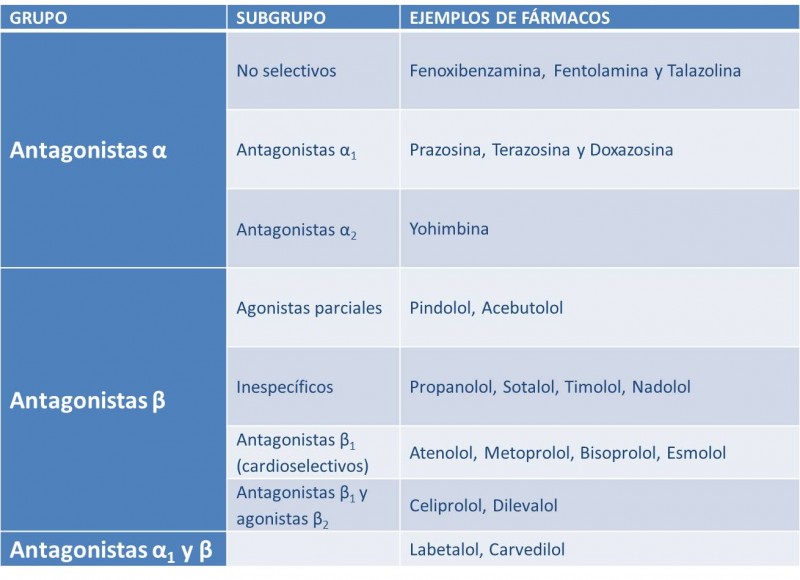 Se han desarrollado antagonistas de los receptores alfa y antagonistas de los receptores ßeta e incluso algunos fármacos presentan selectividad de acción sobre los diferentes subtipos de receptores. Así tenemos los fármacos que se recogen en el siguiente listado: