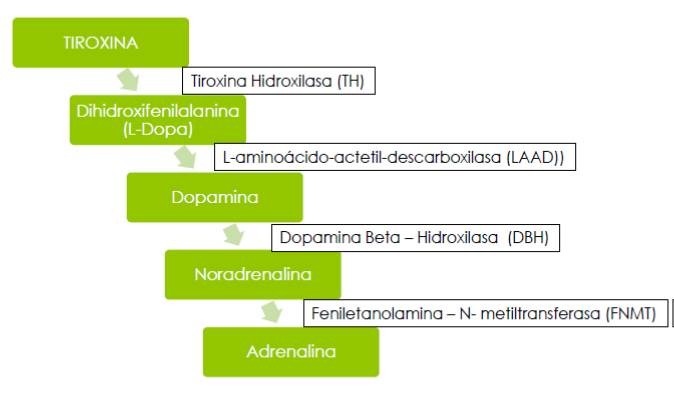 La activación fisiológica de los receptores del SNS se produce, como hemos comentado anteriormente, por las catecolaminas dopamina, noradrenalina y adrenalina que son moléculas obtenidas de forma secuencial a partir de modificaciones del aminoácido tiroxina según la siguiente cadena: