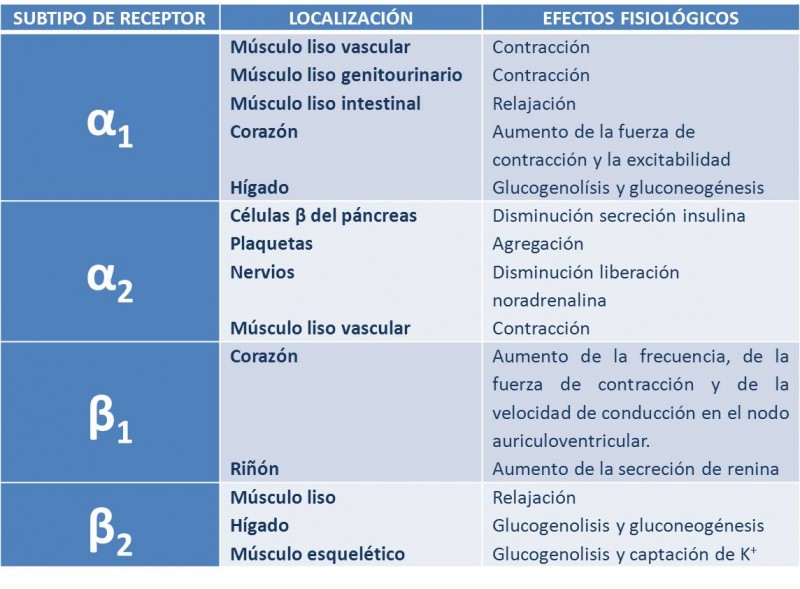 Las catecolaminas sintetizadas, son almacenadas en vesículas y son liberadas, al espacio intersipnático mediante un proceso de exocitosis cuando se produce un potencial de acción que abre los canales de calcio dependientes de voltaje produciendo un flujo de entrada de Ca2+. Una vez liberadas actúan sobre el receptor postsináptico correspondiente produciendo los efectos que se recogen a continuación: