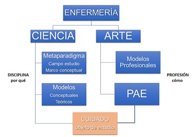 Kérouac afirmaba que la enfermería y, por ende, el cuidado es a la vez arte y ciencia (ver Ilustración X). Se suele distinguir que la enfermería tiene dos ramas de desarrollo: el arte que es la profesión enfermera (el cómo cuidamos las enfermeras a nuestros usuarios en el día a día) y la ciencia que es la disciplina enfermera (el porqué de nuestra profesión, la razón de ser de la disciplina, que viene marcado por el metaparadigma y los modelos teóricos).