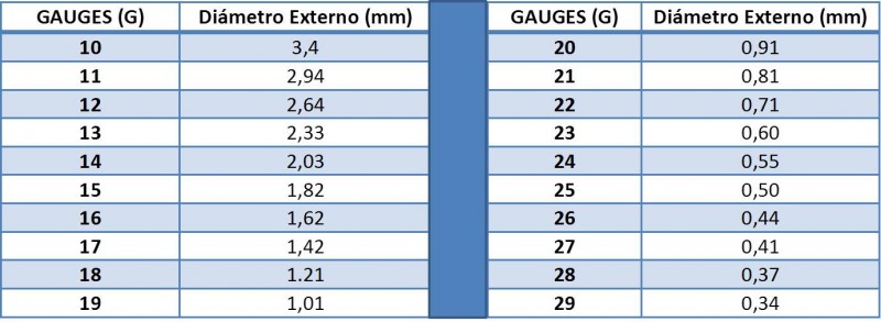 Para los tubos metálicos (agujas, agujas de catéteres periféricos, trócares y otros objetos de punción), la escala utilizada internacionalmente se expresa en función del calibre en “Gauges” o G, por la longitud en pulgadas. Según esta escala, a menor calibre de la aguja corresponderá un mayor número de Gauges o G.