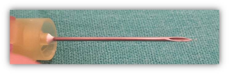- Bisel: corte oblicuo en el borde. La punta de la aguja debe tener un afilado que garantice la agudeza y resistencia necesaria para una buena perforación. Se utilizan biseles largos (menor ángulo) para profundizar en los tejidos, y biseles cortos (mayor ángulo) para la punción de vasos. Las agujas convencionales constan de un triple bisel (la parte inferior del bisel está cortada formando una especie de doble bisel y con las aristas disminuidas por sendos planos que las cortan).