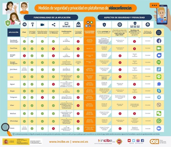 Para aportar algo de luz a este aspecto, se adjunta una infografía procedente de la Oficina de Seguridad del Internauta (OSI) del Instituto Nacional de Seguridad (INCIBE), incluida en la campaña “Quédate en casa, pero seguro”: Medidas de seguridad y privacidad en plataformas de videoconferencia. En dicha infografía se pueden observar algunos aspectos de seguridad y privacidad de diversas plataformas. Dicha información corresponde a las versiones gratuitas de las plataformas a fecha de 15 de abril de 2020 (las versiones premium pueden variar dichas cuestiones).