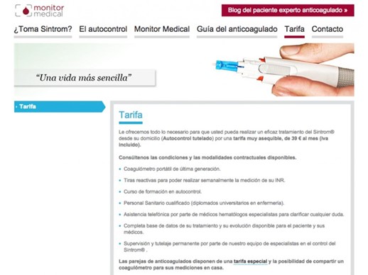 Otro caso interesante es el de control y seguimiento de pacientes con anticoagulantes orales. El programa que inició la empresa Monitor Medical iba más allá del clásico suministro de dispositivos para el autocontrol e incluía una página web en la que se ofrecía información a pacientes, un curso online y un servicio de apoyo al autocontrol en el que por vía telefónica tanto profesionales de enfermería, como médicos hematólogos supervisaban, revolvían dudas y ayudaban a los pacientes en todo lo relacionado con el manejo y control de su enfermedad.