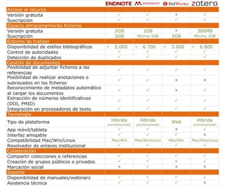 Tabla comparativa de los principales gestores de referencias. Obtenida de iacsaragon.