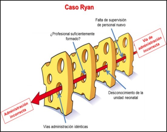 A modo de ejemplo de la aplicación de este modelo, tenemos el conocido caso del primer bebé con gripe A en España: el caso Ryan (Figura 2). Es un claro ejemplo de conjunción de errores humanos (Activos) y errores del sistema (Latentes) que, cuando consiguen superar las barreras de seguridad de la organización, provocan un determinado efecto (con diferente nivel de impacto) en el estado del paciente. Concretamente este incidente de seguridad del paciente fue un Evento Adverso cuyo impacto en el paciente fue la muerte.