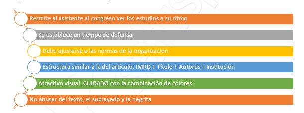 Los pósteres científicos juegan un papel crucial en los congresos académicos y profesionales. Estos eventos reúnen a investigadores, profesionales y estudiantes de diversas disciplinas para compartir avances, discutir ideas y fomentar colaboraciones. En este contexto, los pósteres sirven como una herramienta visual y concisa para presentar investigaciones y hallazgos de manera efectiva (32).