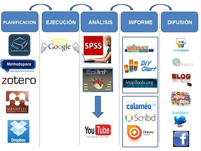 Si tenemos en cuenta las etapas del método científico (planificación, ejecución, análisis, elaboración del informe y difusión) obtenemos una clasificación de recursos 2.0 como los que aparecen en la siguiente figura: