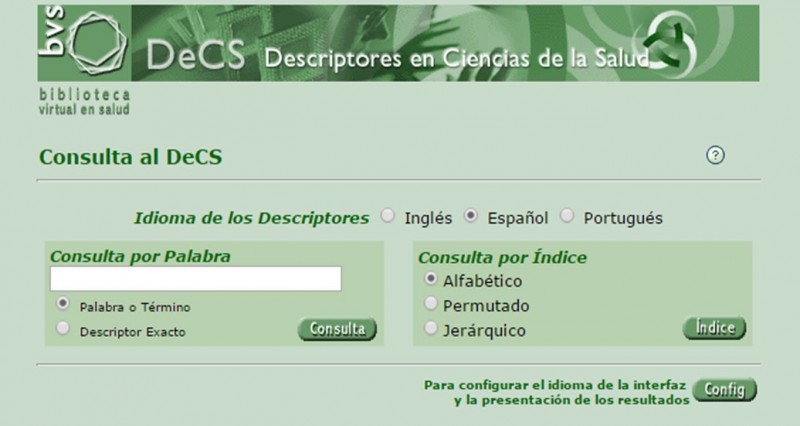 DeCS (Descriptores en Ciencias de la Salud): creado por BIREME para la indexación de documentación así como para ser utilizado en las búsquedas realizadas en las bases de datos más consultadas en el ámbito latinoamericano (LILACS, BVS etc.).