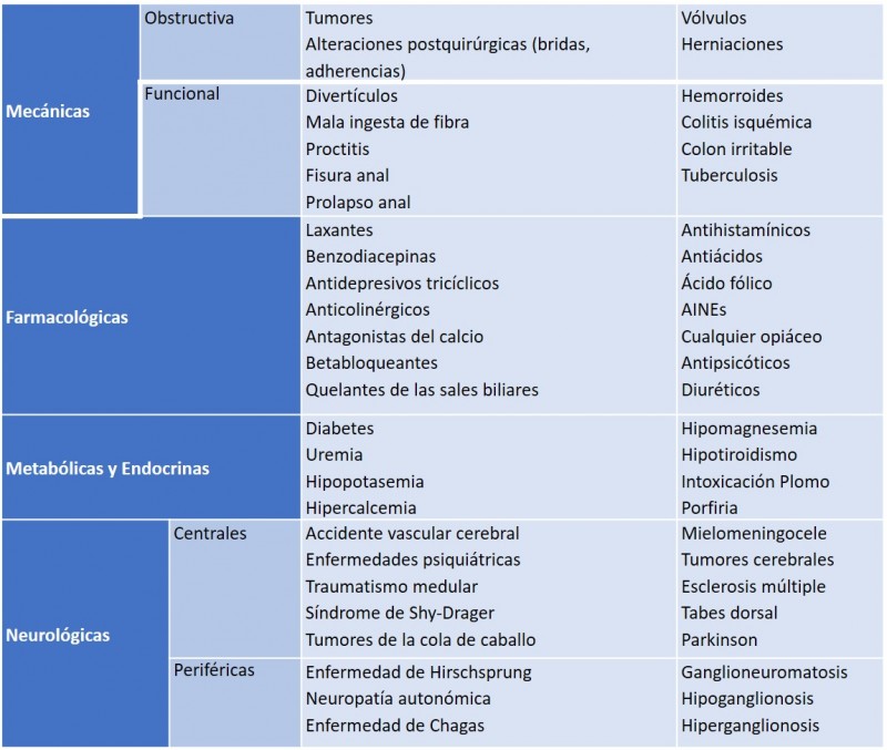 Las causas del estreñimiento pueden obedecer a múltiples orígenes. Lo más habitual es encontrase ante un estreñimiento crónico primario o idiopático, pero también existe un estreñimiento crónico secundario. En la Tabla 4 se presentan las causas más importantes del estreñimiento secundario.