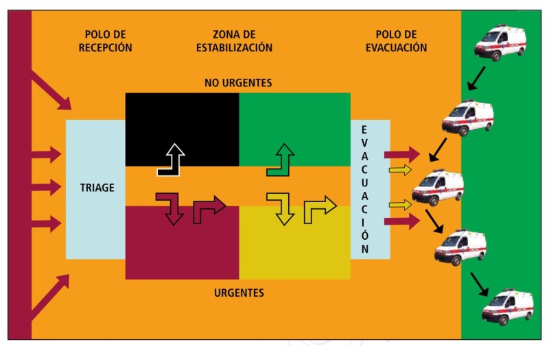 Ilustración 3 .Sectorización. Fuente: https://www.researchgate.net/figure/Puesto-medico-avanzado-esquema-funcional-del-flujo-de-victimas_fig4_272641474