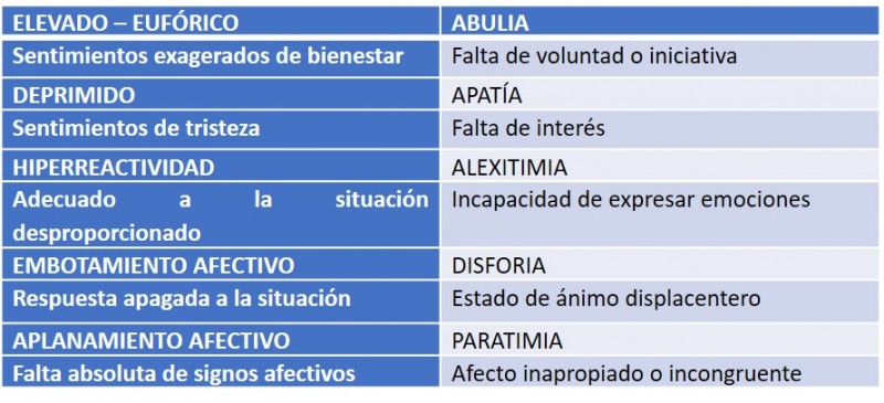 - Afecto. Hace referencia a la muestra emocional que hace la persona de su estado de ánimo.