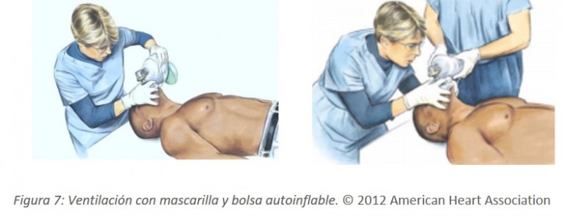 Se debe utilizar una bolsa autoinflable para paciente adulto (de 1 a 2 l) para administrar un volumen corriente de aproximadamente 500-600 ml para pacientes adultos, volumen suficiente como para producir una elevación visible del tórax y mantener la oxigenación y los niveles normales de dióxido de carbono en pacientes apneicos.