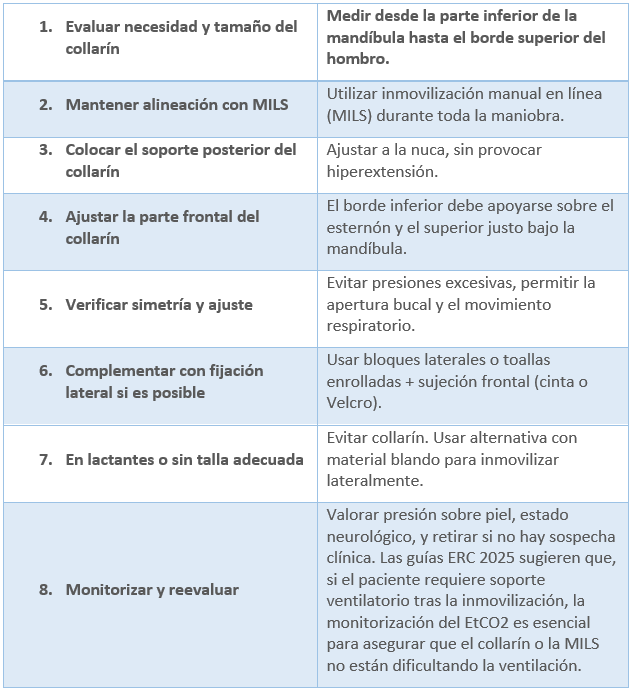 En caso de estar indicada la colocación del collarín cervical, se deben seguir los pasos descritos en la siguiente tabla; elaborada según las recomendaciones actualizadas del ERC (2025), ATLS (2023), NICE (2022), SECIP (2023) y RCEM (2022):