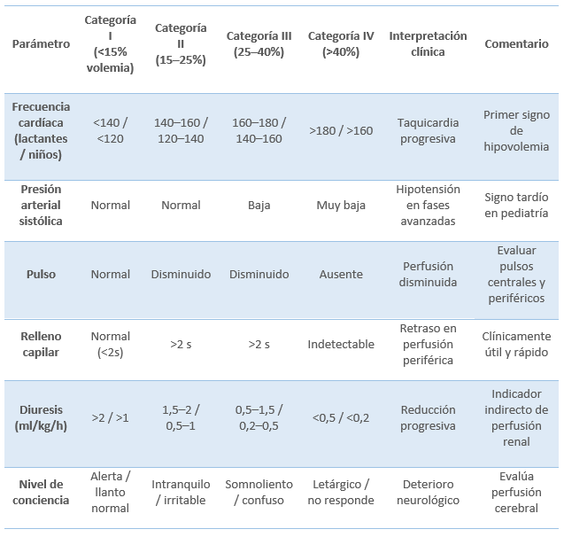 La siguiente tabla muestra una clasificación práctica y actualizada del shock hipovolémico en cuatro categorías según la estimación del volumen perdido y las manifestaciones clínicas asociadas: