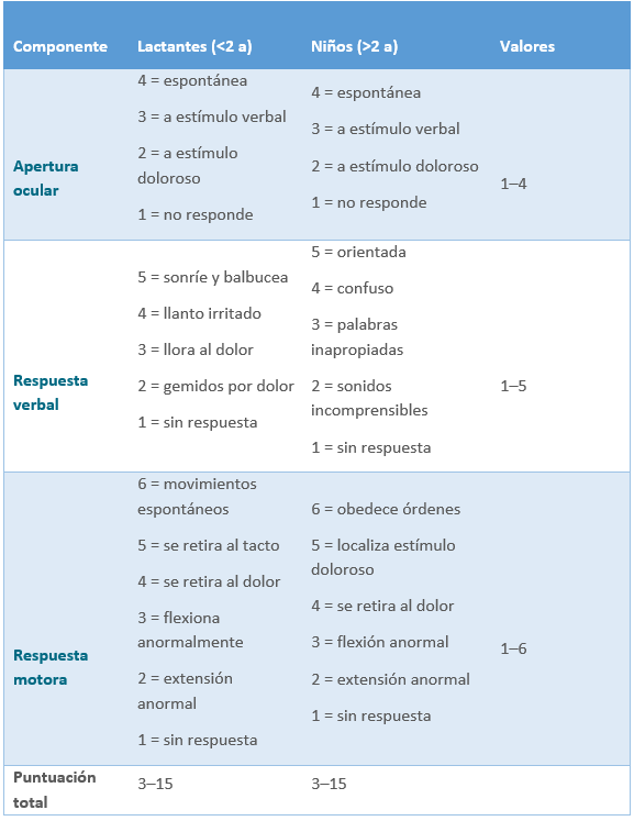 - Merck Manual. Modified Glasgow Coma Scale for infants and children [Internet]. Rahway (NJ): Merck & Co., Inc.; 2025 [citado 2025 Jun 2]. Disponible en: https://www.merckmanuals.com