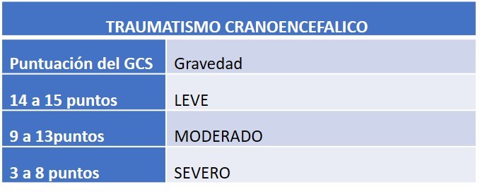 Los TCE se agrupan o clasifican según la alteración del nivel de conciencia estimada según la “Glasgow coma scale” (GSC) (tabla 2). Y lo hacen en tres categorías de TCE: leve, moderado y grave. Como observamos en la tabla expuesta se considera grave todo TCE con una puntuación igual o inferior a 8 puntos según la GCS, aunque deben tenerse presente varias condiciones previas y es haber descartado y corregido aquellas situaciones que incrementan el deterioro de la conciencia como: drogas, shock, hipoxemia severa, etc. Podríamos también considerar TCE graves todos aquellos intervenidos de una lesión ocupante de espacio intra o extraaxial independientemente de su nivel de conciencia, dado que en la práctica precisan de idénticos cuidados en la fase aguda que los TCE graves.