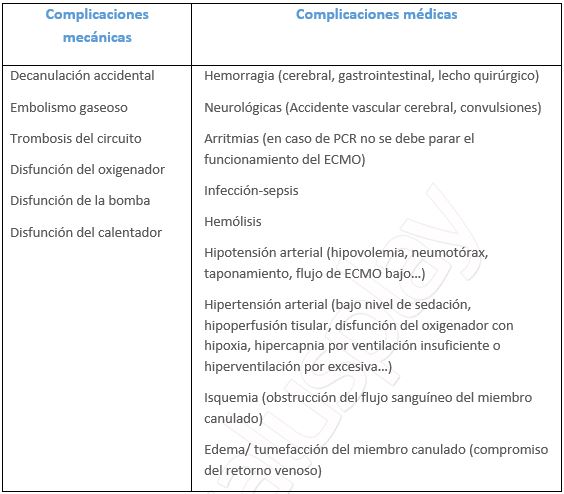 Las complicaciones derivadas del tratamiento con ECMO siempre son graves y potencialmente fatales por lo que el personal médico y de enfermería debe tener una adecuada formación sobre el tratamiento y debe haber un seguimiento y control contínuo del paciente. Las complicaciones se dividen en mecánicas y médicas.