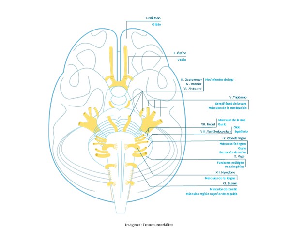 Del tronco encefálico emanan los nervios llamados pares craneales, nervios que inervan la cabeza, tanto para la función motora como la sensitiva; algunos tienen más funciones como regular la secreción lagrimal o salivar.