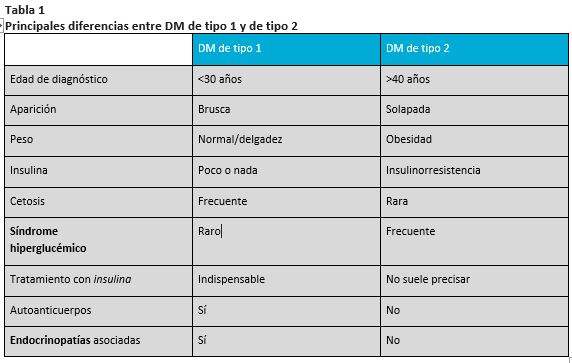 Principales diferencias entre DM de tipo 1 y de tipo 2