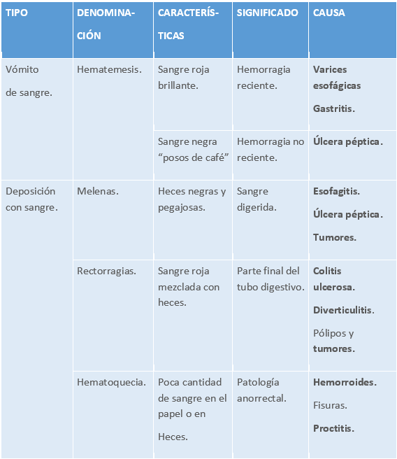 El sangrado es el signo principal. Puede presentarse de diferentes formas en función de la causa subyacente, pero, como se refleja en la tabla 8, pueden agruparse en 2 tipos: vómito de sangre o deposición con sangre.