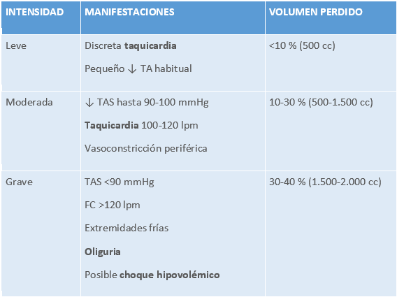 Manifestaciones clínicas según pérdida sanguínea