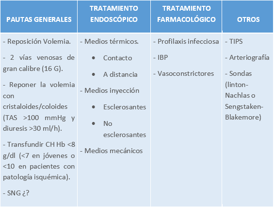 Endoscopia, (permite la visión directa de la lesión y ciertos tratamientos curativos), y arteriografía (localización y posible tratamiento mediante embolización selectiva del vaso sangrante). El tratamiento se recoge en la tabla siguiente.