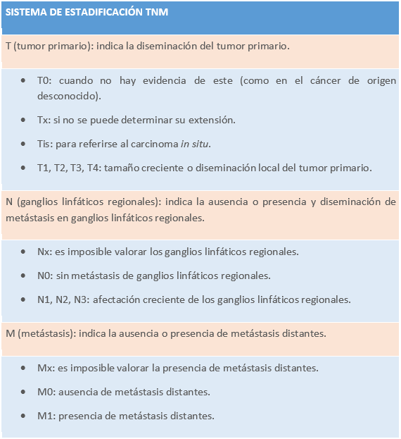 El sistema de tumor, ganglios (nodes) y metástasis (TNM) es uno de los métodos más utilizados para describir numerosos tumores sólidos.