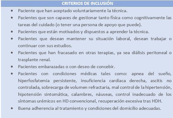 Tabla 16. Criterios de inclusión para un programa de hemodiálisis domiciliaria. Elaboración propia.