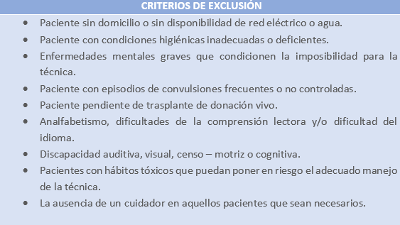 - Necesidad de disponer de un espacio en el domicilio para instalar el monitor, el equipo para el tratamiento del agua, el drenaje y almacenar el material necesario para llevar a cabo la técnica.