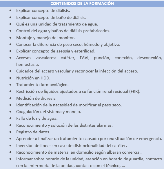 Tabla 21. Principales contenidos para el entrenamiento y la formación de los pacientes para HDD. Elaboración propia.