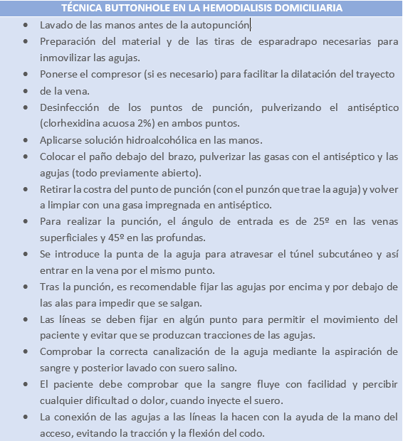 Por otro lado, la imposibilidad para canalizar la FAVI nativa no contraindica tampoco la terapia, pero los profesionales de enfermería si deberán adecuar las punciones a las complicaciones que puedan surgir durante el entrenamiento y prevenir las que se puedan dar en el domicilio. Por ello, se elegirán técnicas de autopunción que faciliten el manejo del acceso como de la de buttonhole.