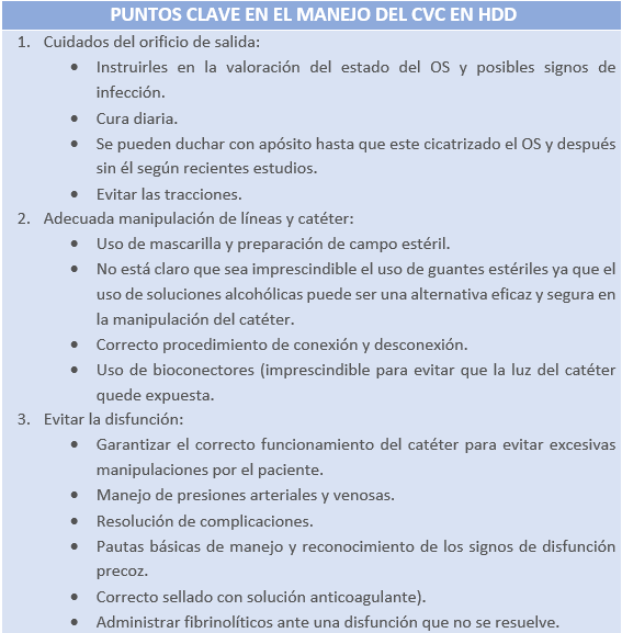 Tabla 23. Puntos clave en el manejo del CVC en el paciente en HDD. Elaboración propia.