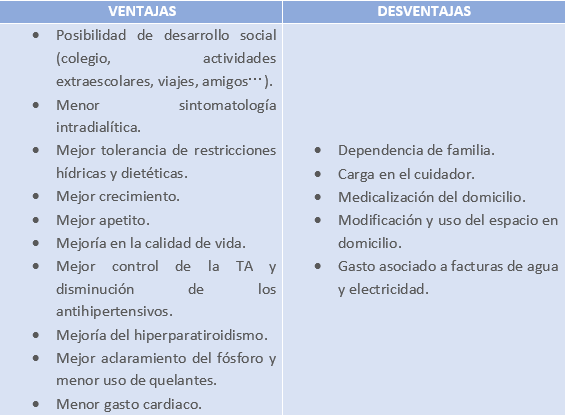 Las unidades de diálisis pediátrica se encuentran centralizadas en unidades de referencia por lo que, en algunas ocasiones, pacientes y familias deben recorrer largas distancias para su tratamiento. Debido a esto, se prioriza en esta edad el trasplante renal anticipado a las terapias domiciliarias como la diálisis peritoneal o la HDD. Este tipo de terapias coinciden en la mejoría en el crecimiento y la reducción del número de fármacos para el control de la tensión arterial y del fósforo. Aun así, lo más destacable es la posibilidad de asistencia del infante a centros educativos y la mejoría en el bienestar y la satisfacción individual y familiar.