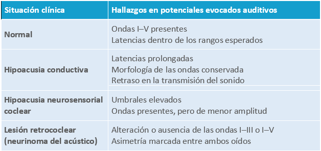 Se utiliza para detectar sordera neonatal, diferenciar hipoacusia coclear vs retrococlear, evaluar integridad del nervio auditivo o diagnosticar neurinoma del acústico.