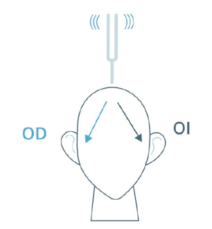 Se hace vibrar un diapasón y, entonces, se coloca con su base tocando la línea media craneal y se pregunta al paciente por qué oído oye más. Lo normal es que lo oiga por los dos por igual.