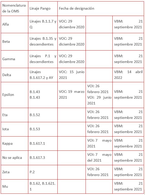 - Variante de grandes consecuencias (VOHC): clara evidencia de que las medidas de prevención o clínicas han reducido significativamente la efectividad con respecto a las variantes que circularon previamente.
