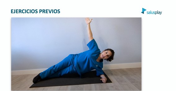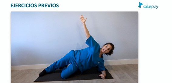 - Plancha lateral. En un nivel inicial nos colocaremos de lado, La pierna que esté en la parte inferior se flexionará, el codo apoyado flexionado y el hombro a la altura del codo. Elevaremos la cadera manteniendo la contracción abdominal hasta que el cuerpo tiemble. Realizar de 3 a 5 repeticiones a ambos lados.