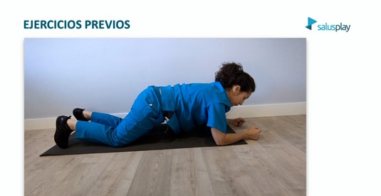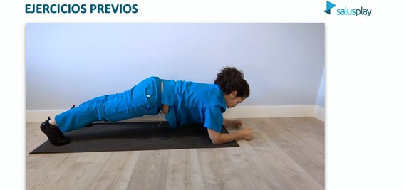 - Iniciaremos de menor a mayor intensidad, en decúbito prono apoyaremos las rodillas, los codos estarán flexionados y los hombros a la altura de los codos, echaremos el cuerpo hacia adelante y controlando que no se hunda la lumbar. Activamos el transverso (metiendo el ombligo hacia adentro) y mantenemos la posición hasta que el cuerpo tiemble y descansamos. Realizar 5 repeticiones.