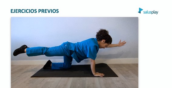 En cuadrupedia, haremos extensión de cadera alternando una pierna y el brazo contrario, con la contracción previa del transverso para estabilizar la columna lumbar. Realizar 5 repeticiones lentas con cada lado.