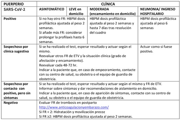 Dado que el puerperio es un estado de hipercoagulabilidad, COVID-19 se asociaría con un aumento de riesgo de tromboembolismo venoso, que además se incrementaría por la situación de inmovilidad por el confinamiento. Es importante valorar el riesgo trombótico.
