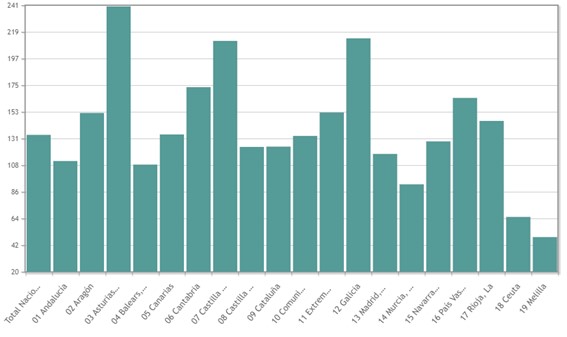 Figura 2: Índice de envejecimiento por comunidades autónomas. INEwww.ine.es |