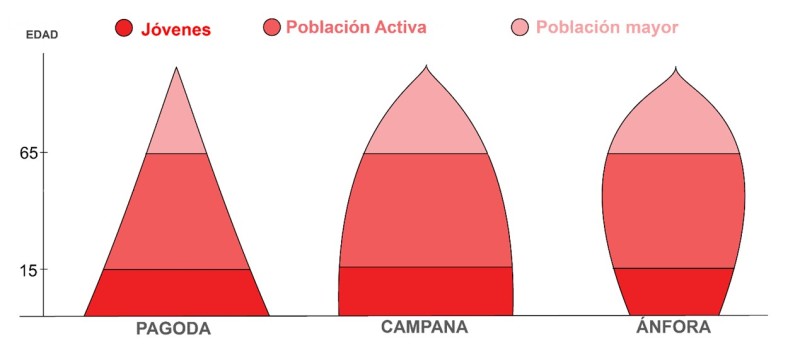 Figura 4: Tipos de pirámides poblacionales. Adaptación de https://commons.wikimedia.org/wiki/File:Typy_vekovych_pyramid.png Public Domain |