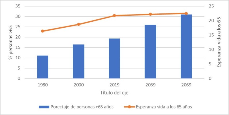 En la España actual el envejecimiento de la población es algo evidente, y este fenómeno va a seguir creciendo. Así, en las proyecciones de población realizadas por el INE se pone de manifiesto que el envejecimiento de la población seguirá en aumento, lo que supondrá que en el año 2035 la población mayor de 65 años se sitúe en el 26,5% del total y en el año 2050 será todavía más alto, colocándose en el 31,4%. En el mismo documento de proyecciones del INE se estima que la esperanza de vida a los 65 años en el año 2069 se situará en 22,5 años para los hombres y 26,3 años en el caso de las mujeres, lo que supone que las personas vivan mucho más tiempo tras la jubilación en comparación con décadas anteriores, tensionando así el sistema de pensiones.
