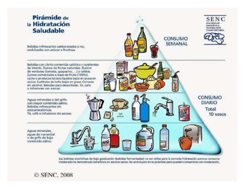 La Sociedad Española de Nutrición Comunitaria (SENC) propone la pirámide de la hidratación saludable para cubrir las necesidades hídricas y clasificar los diferentes tipos de bebidas.