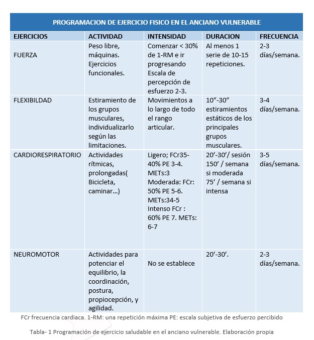 Tabla- 1 Programación de ejercicio saludable en el anciano vulnerable. Elaboración propia