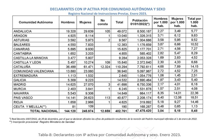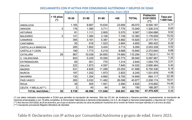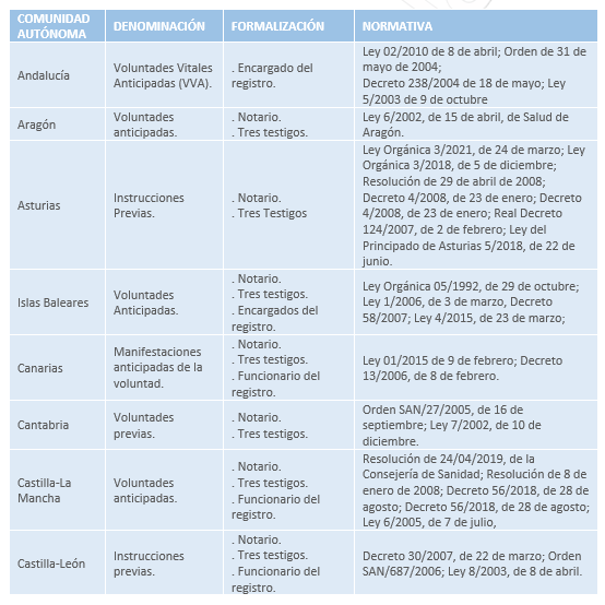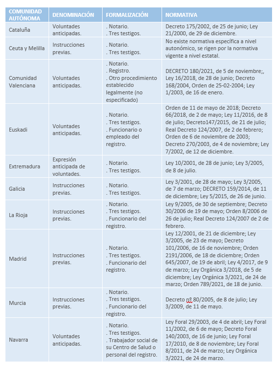 - Voluntades anticipadas: Aragón, Cataluña, Islas Baleares, Castilla-La Mancha, País Vasco, Navarra y Comunidad Valenciana
