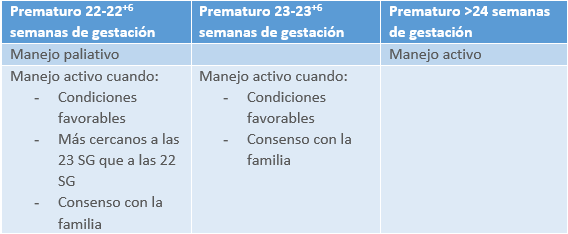 En aquellos partos que acontezcan de forma prematura entre las 22 y las 22+6 semanas de gestación indica un manejo más bien paliativo, aunque plantea la posibilidad de un manejo más proactivo en aquellos recién nacidos con condiciones favorables, más cercanos a las 23 semanas y en los que la familia esté a favor de este tipo de manejo.