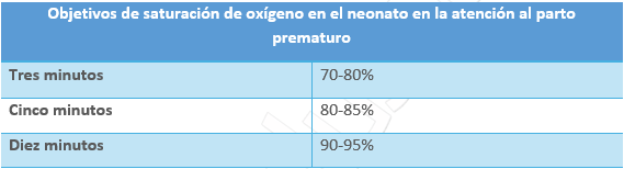 - La FiO2 se ajustará para alcanzar los objetivos deseados: al cabo de 3 minutos, una SpO2 del 70-80 %; a los 5 minutos, una SpO2 del 80-85 %; y a los 10 minutos, una SpO2 del 90-95 %.