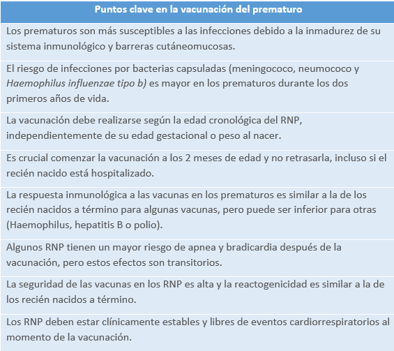 La enfermedad invasiva por Haemophilus influenzae tipo b (Hib), Streptococcus pneumoniae o neumococo, y Neisseria meningitidis o meningococo, es más frecuente y mortal en prematuros que en recién nacidos a término. La respuesta a las vacunas es menos efectiva en prematuros y está influenciada por la edad gestacional y el peso al nacer. Aunque hay pocos estudios sobre la efectividad de las vacunas en prematuros, se ha observado que la vacunación con la pauta recomendada puede prevenir la enfermedad. Se recomienda vacunar a los prematuros siguiendo el calendario de vacunación estándar, independientemente de la edad gestacional, con énfasis en la vacunación oportuna para beneficiarse de la protección comunitaria.